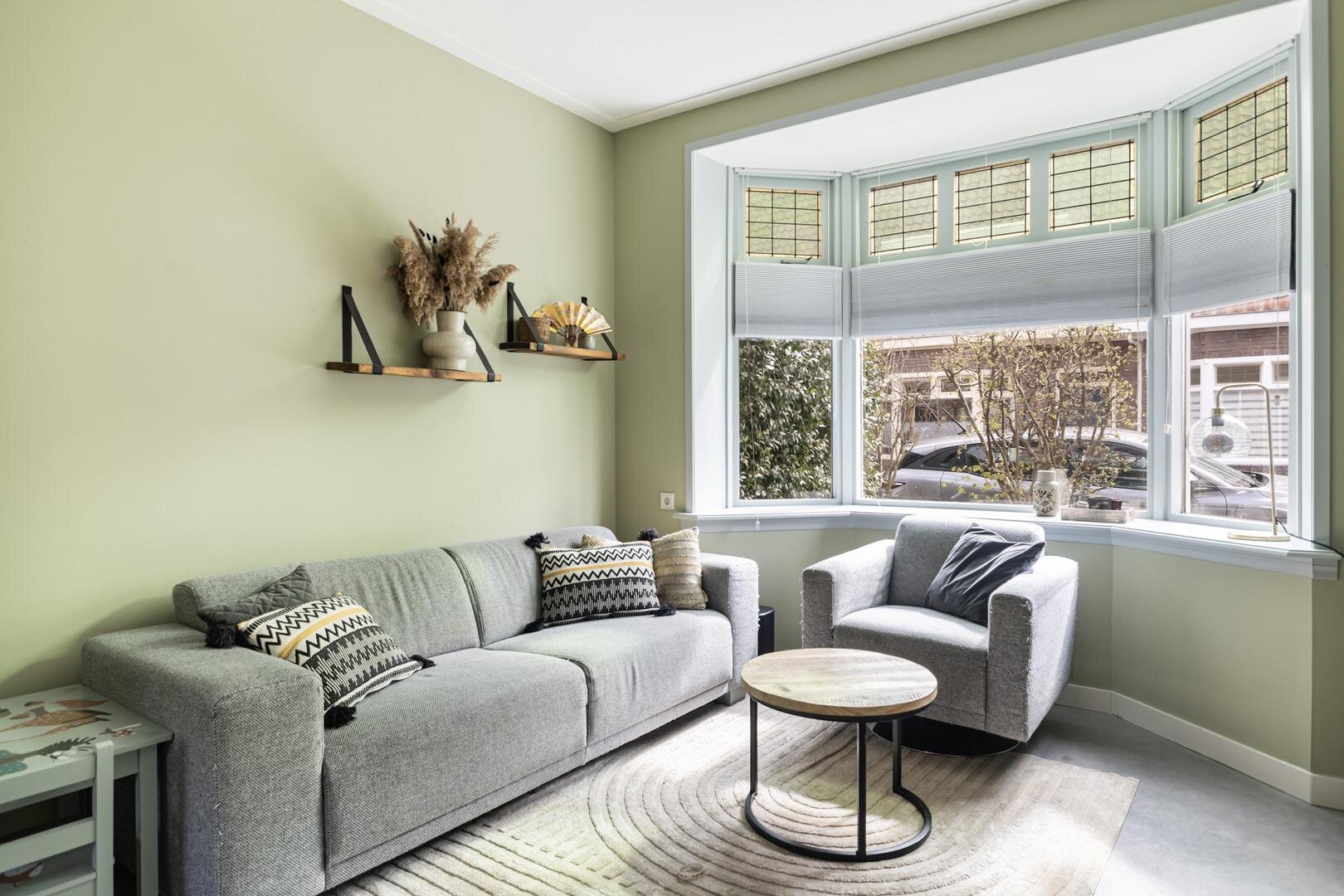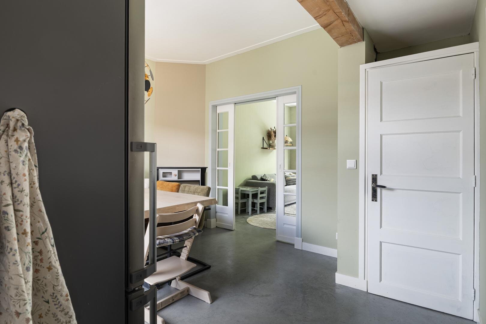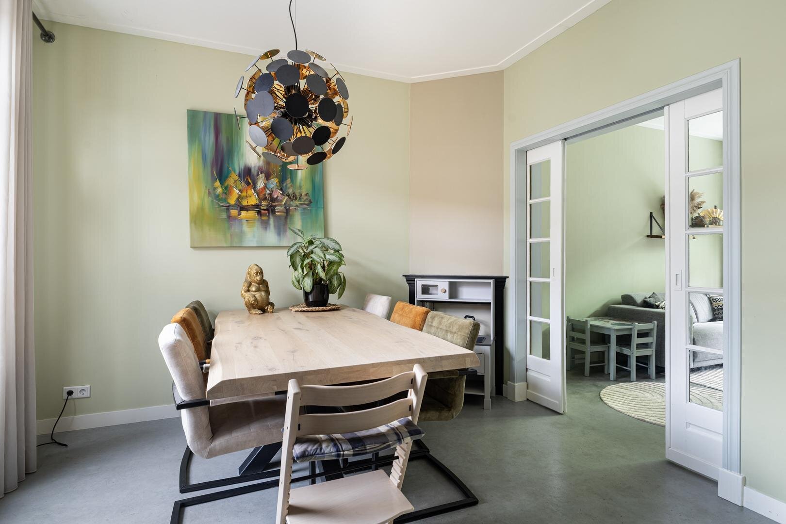 De karakteristieke woonkamer combineert sfeer met comfort, waarbij originele details mooi tot hun recht komen. De doordachte indeling en de grote raampartijen zorgen voor een fijne lichtinval en een ruimtelijk gevoel. Vanuit de woonkamer geven de en suite deuren toegang tot de moderne woonkeuken, die dankzij de eveneens grote raampartij heerlijk licht is. De keuken is strak afgewerkt en voorzien van diverse inbouwapparatuur, waaronder een inductiekookplaat met afzuiging en een oven.