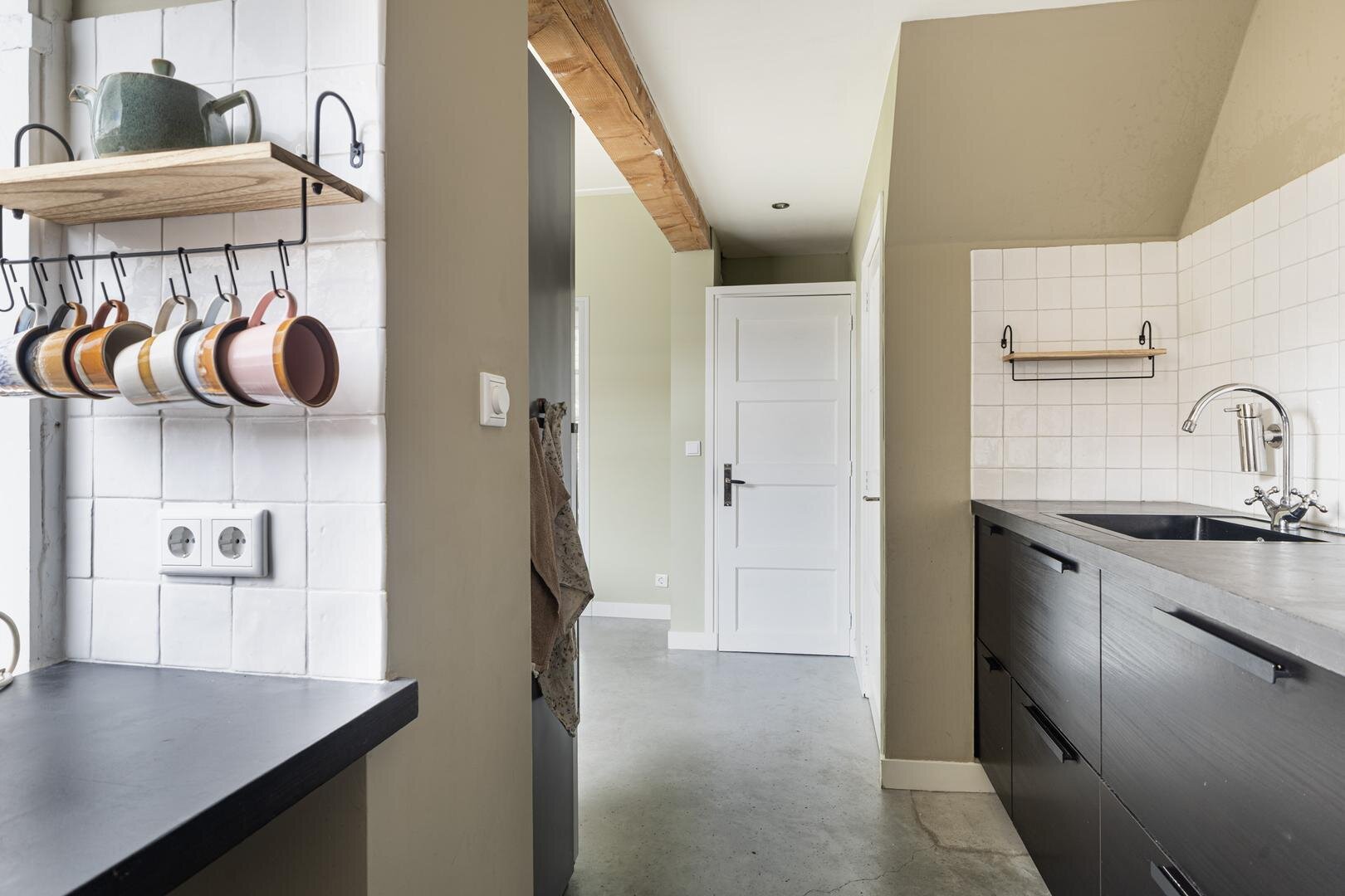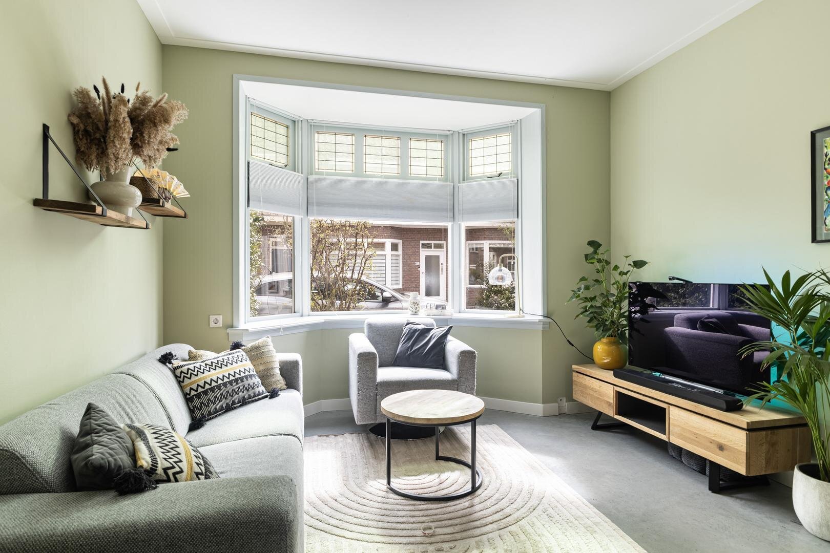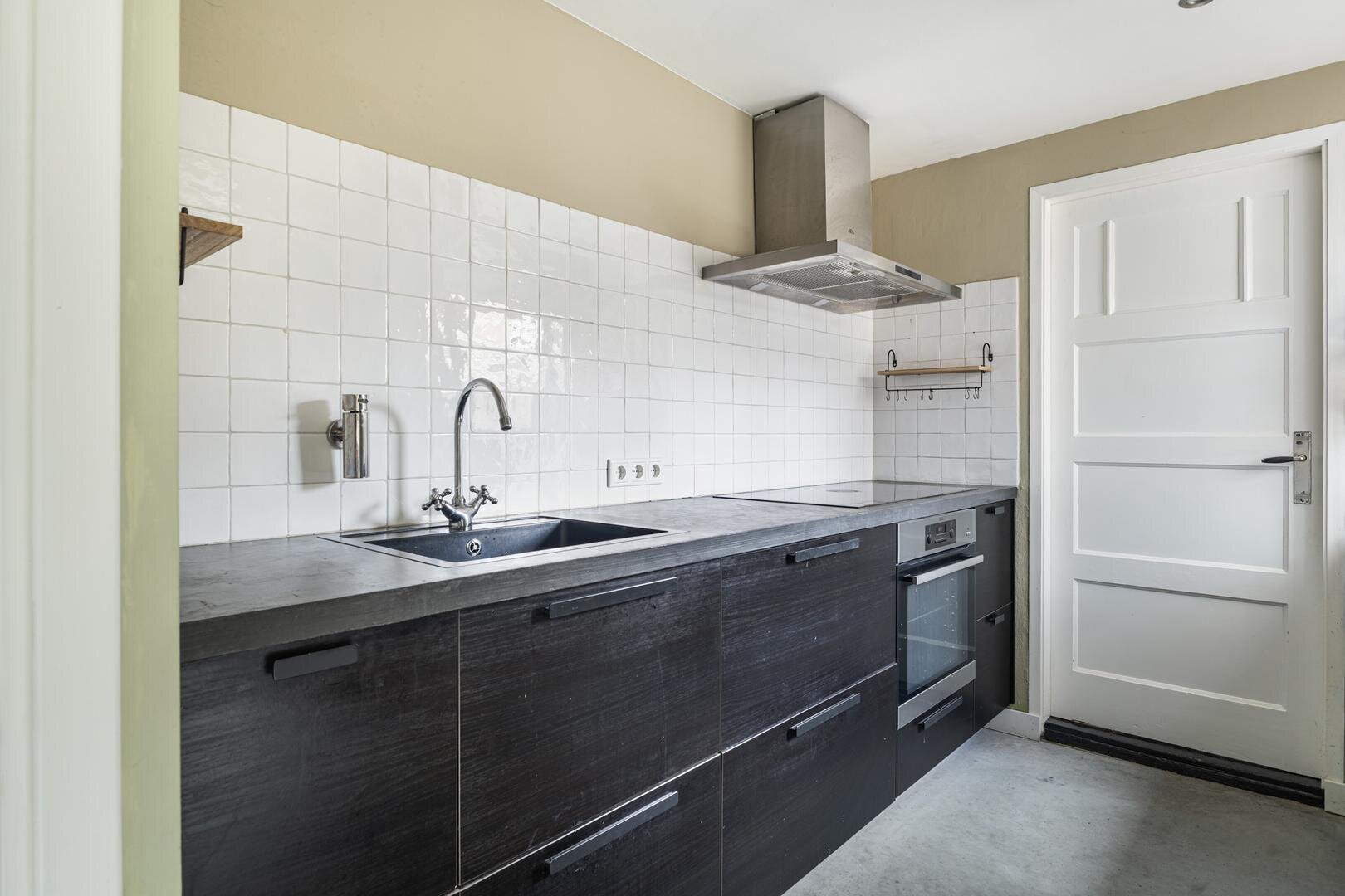 De karakteristieke woonkamer combineert sfeer met comfort, waarbij originele details mooi tot hun recht komen. De doordachte indeling en de grote raampartijen zorgen voor een fijne lichtinval en een ruimtelijk gevoel. Vanuit de woonkamer geven de en suite deuren toegang tot de moderne woonkeuken, die dankzij de eveneens grote raampartij heerlijk licht is. De keuken is strak afgewerkt en voorzien van diverse inbouwapparatuur, waaronder een inductiekookplaat met afzuiging en een oven.