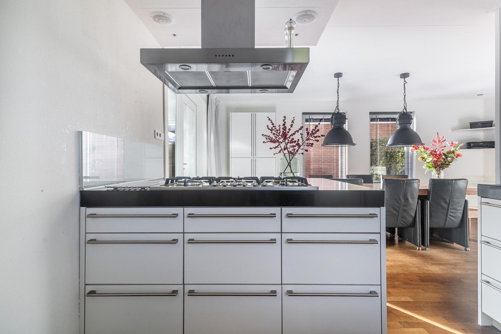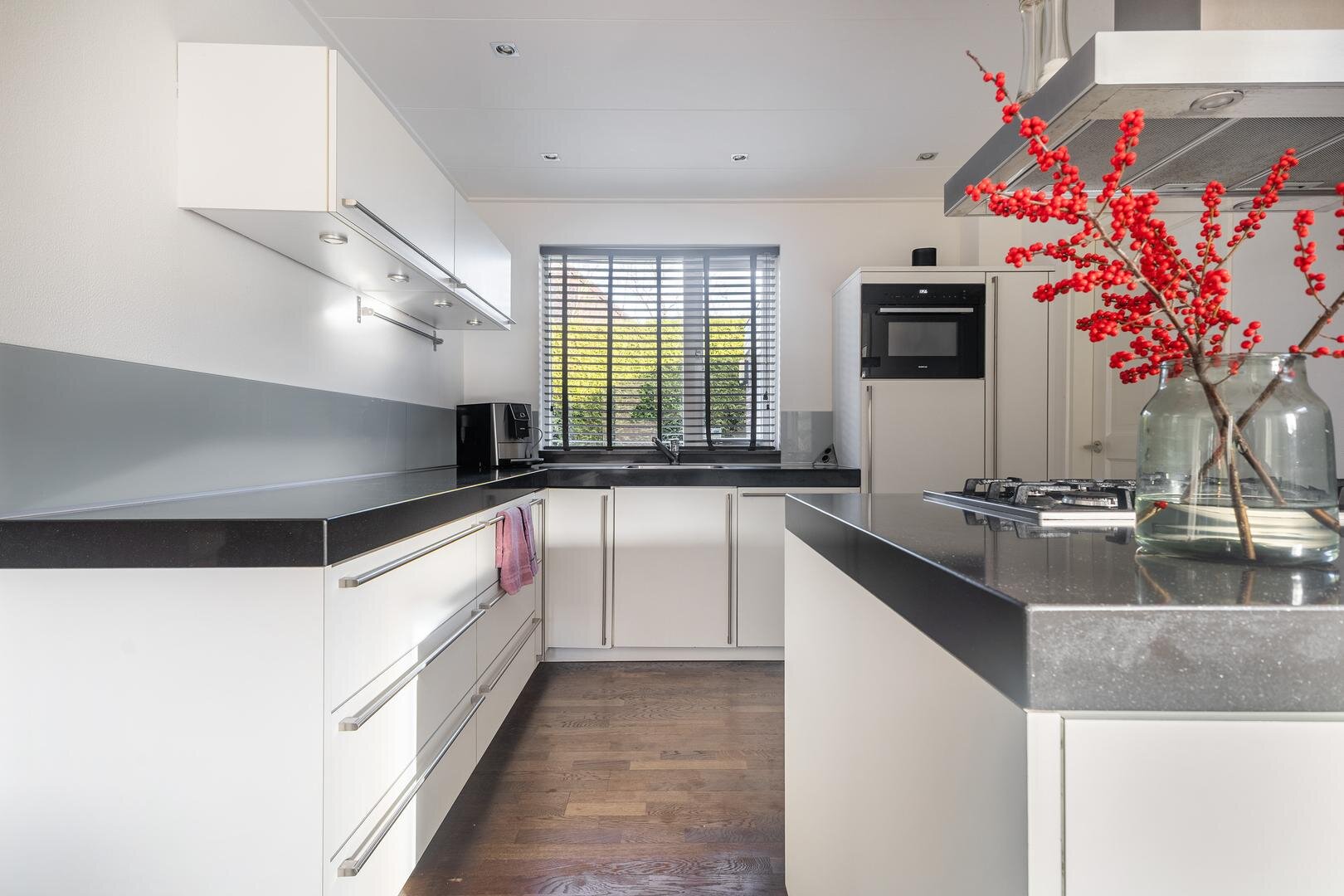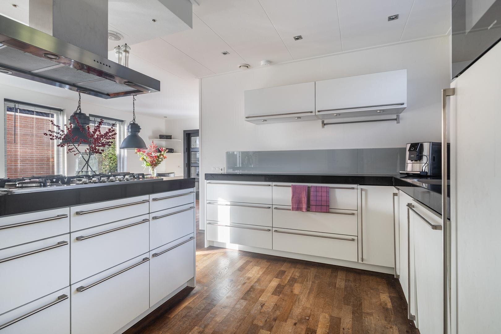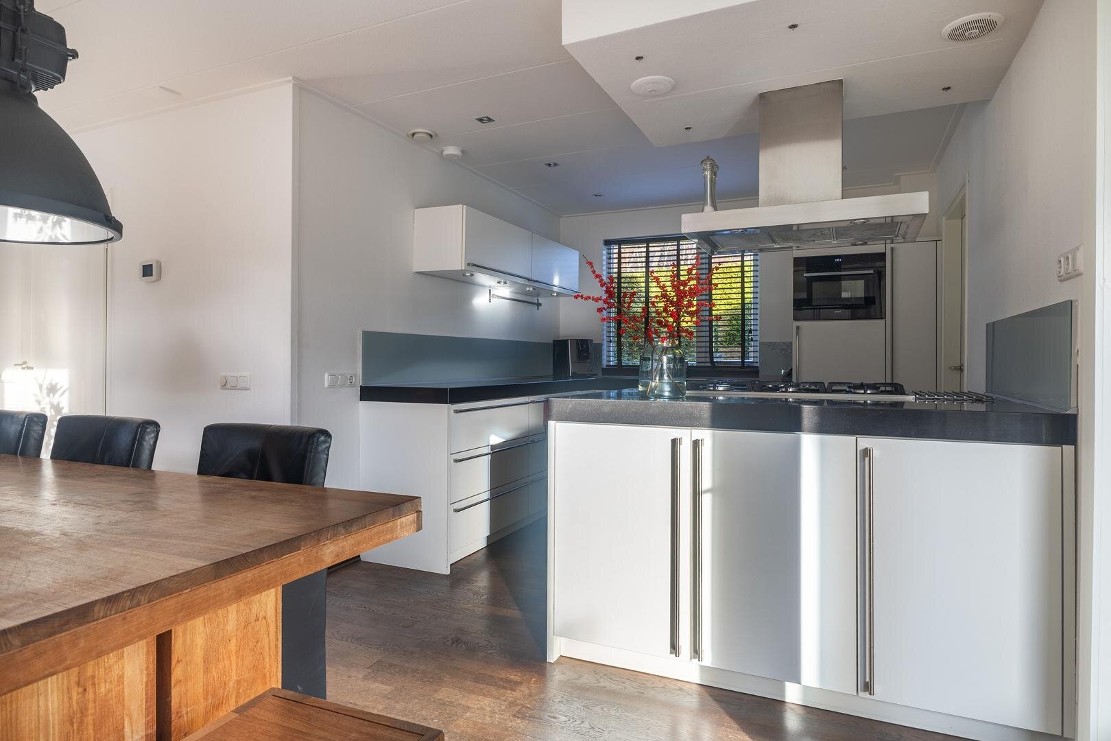 - open keuken met composiet werkblad en inbouwapparatuur: 6-pits gasfornuis, afzuigkap, vaatwasser, koelkast en combi-oven.