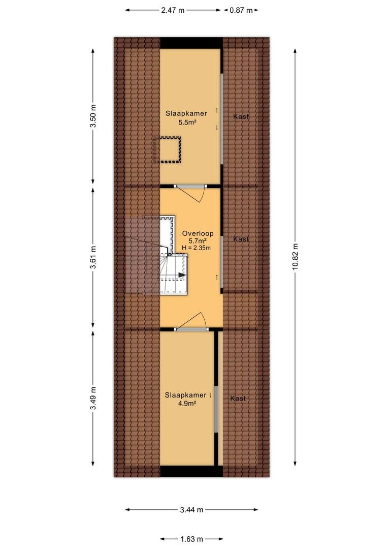 - 1e slaapkamer over de gehele breedte van de woning (circa 16 m2) met vaste kastenwand