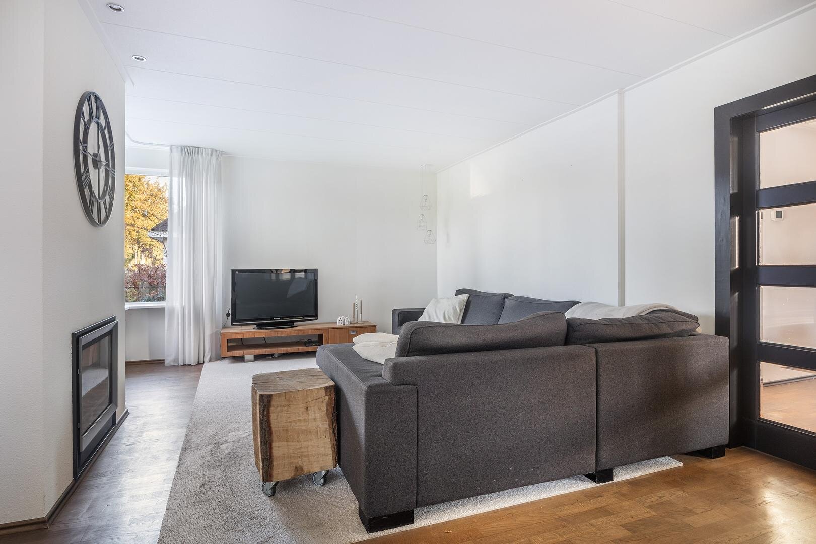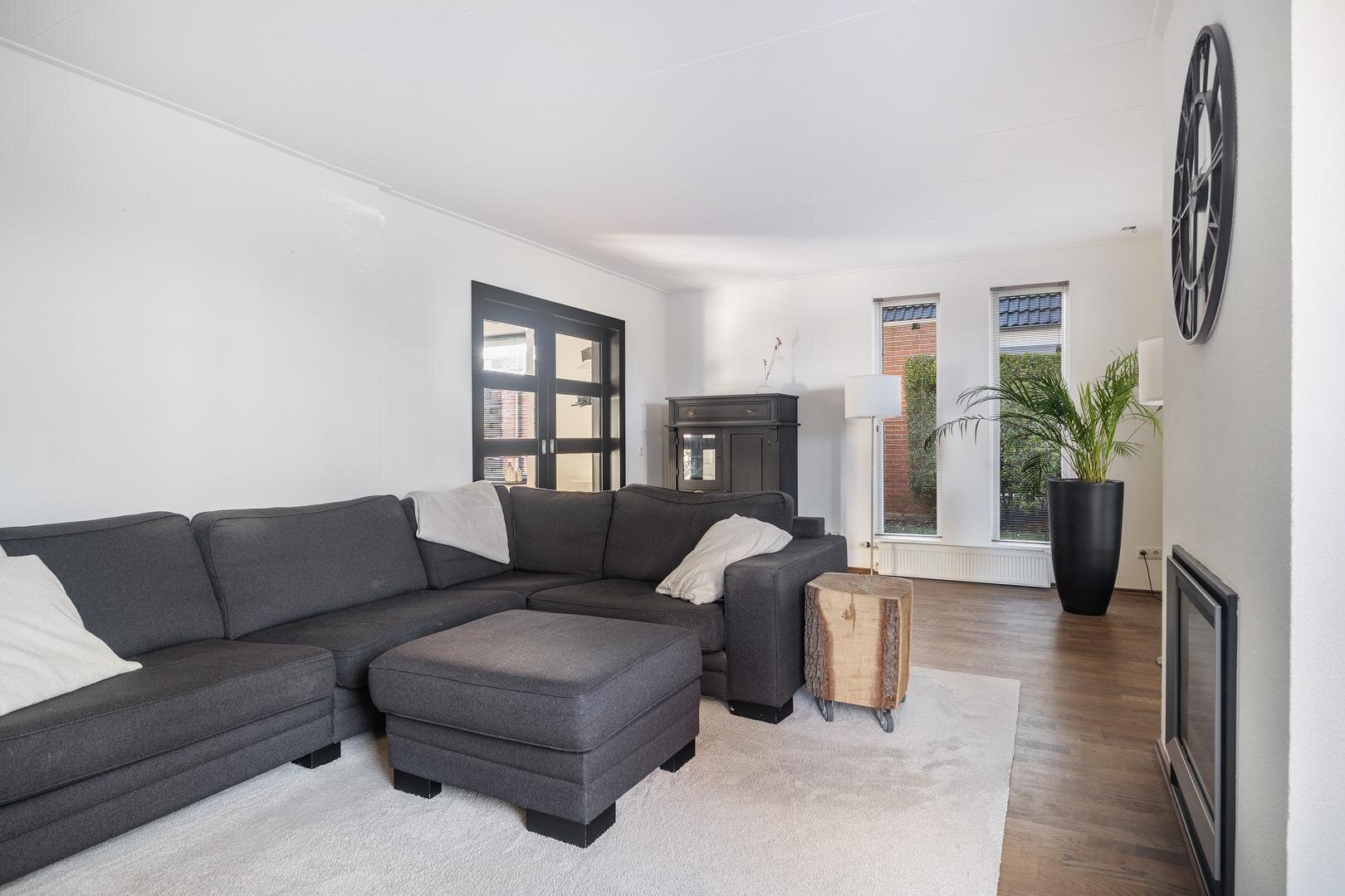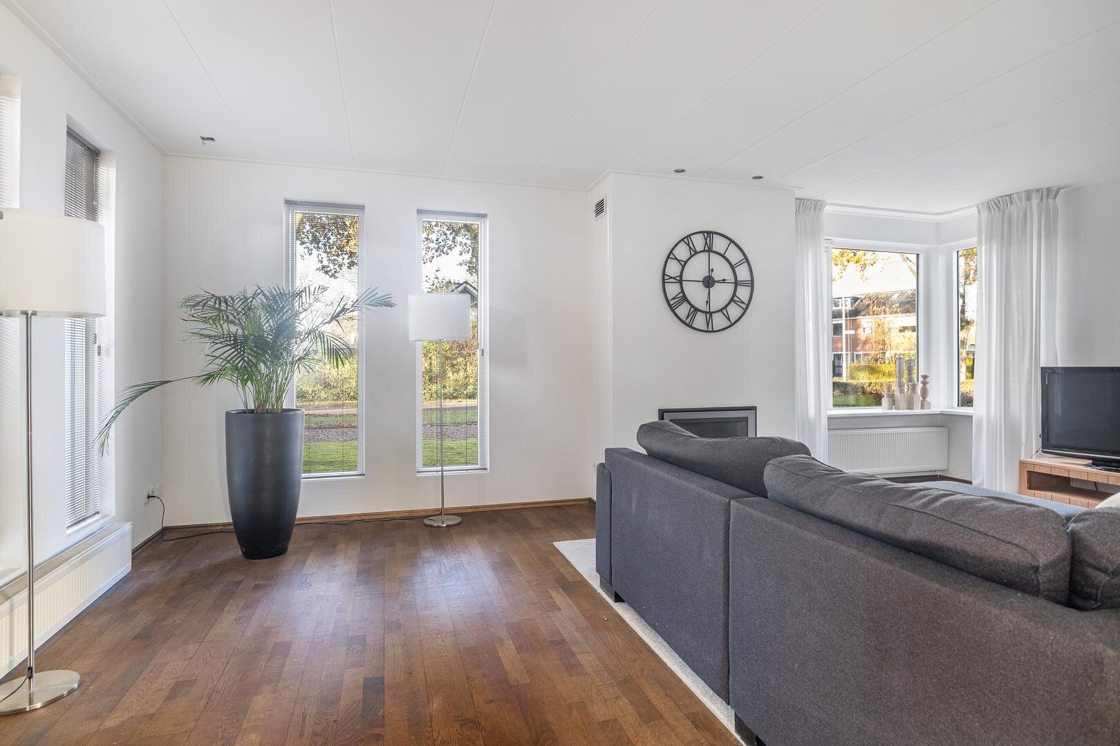- lichte woonkamer met meerdere raampartijen, parketvloer en een sfeervolle gashaard