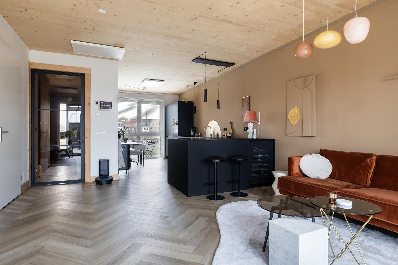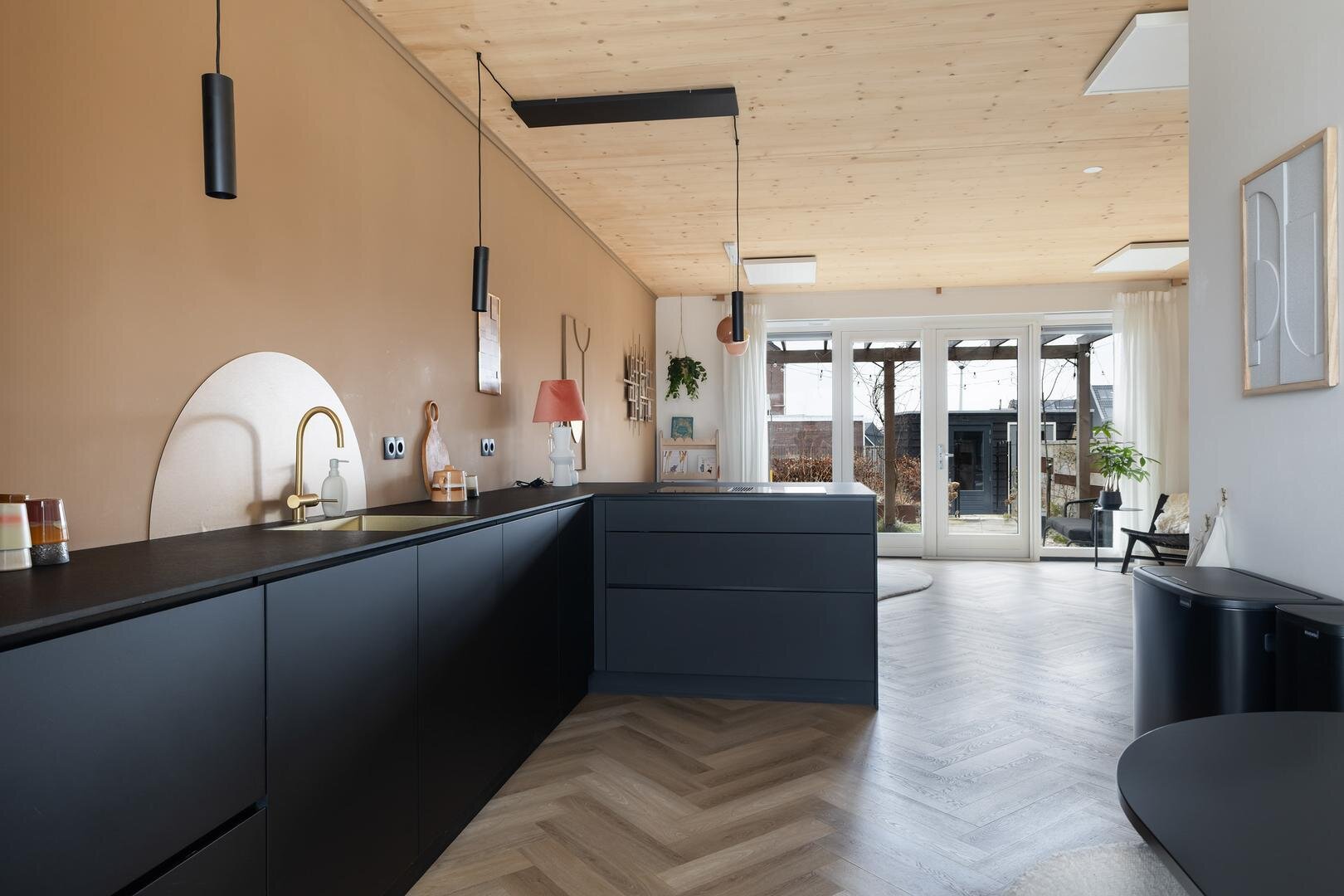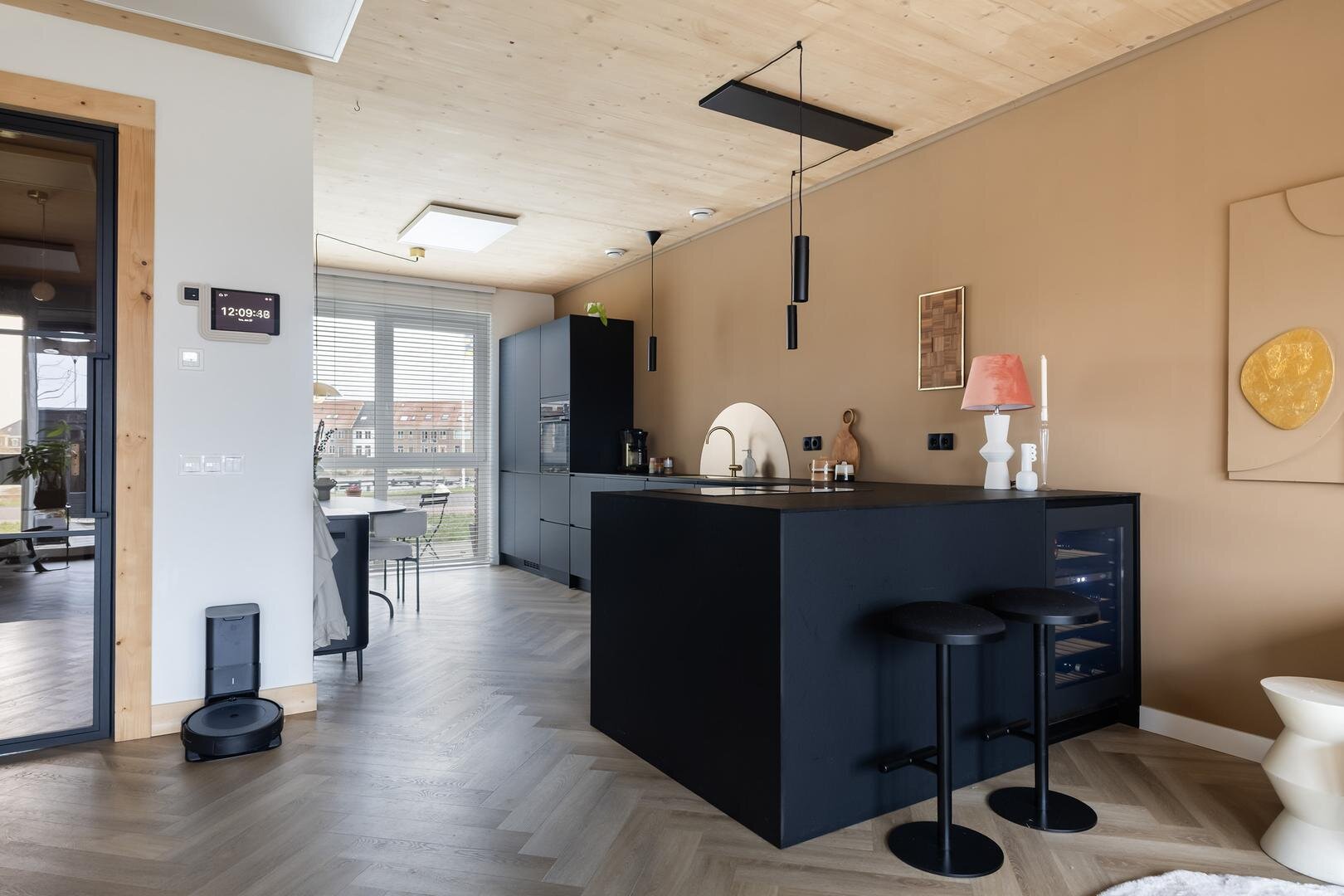- woonkeuken met schiereiland en fraaie details. Inclusief inbouwapparatuur: recirculatie-inductiekookplaat, stoomoven, klimaatkast, vaatwasser, koelkast en vriezer