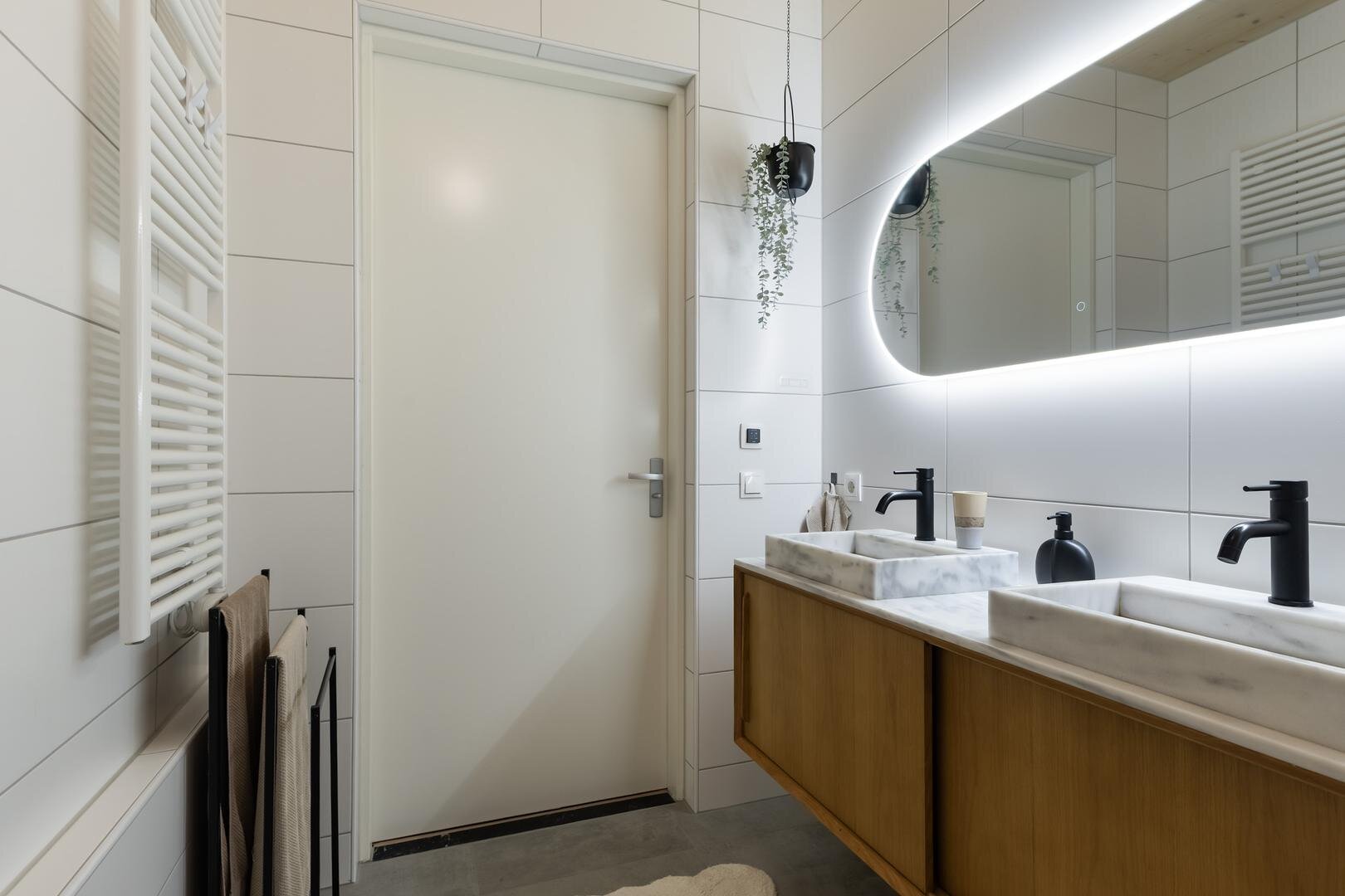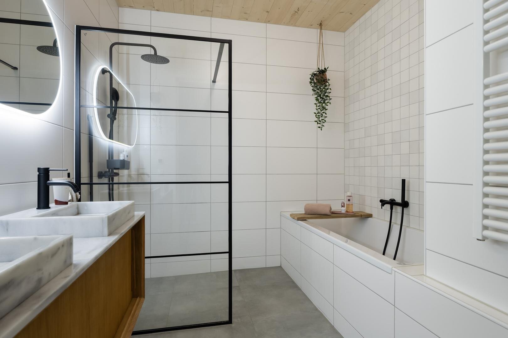 - moderne badkamer met ligbad, inloopdouche en dubbele wastafel met meubel