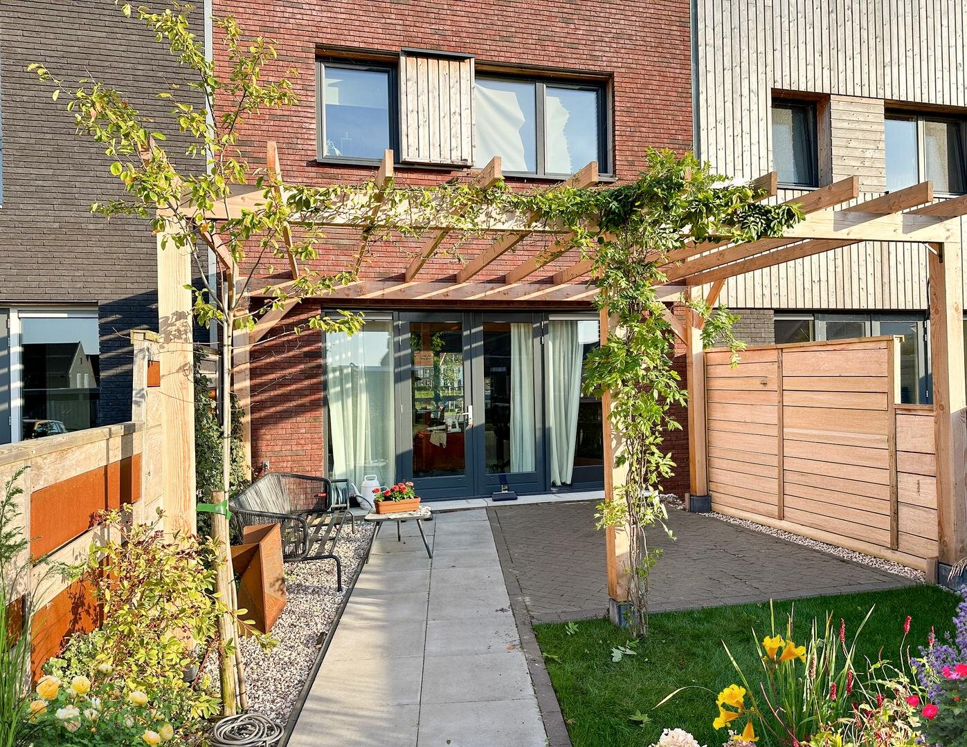 - zonnige achtertuin op het westen, voorzien van fraaie tuinaanleg met pergola en vrijstaande houten berging