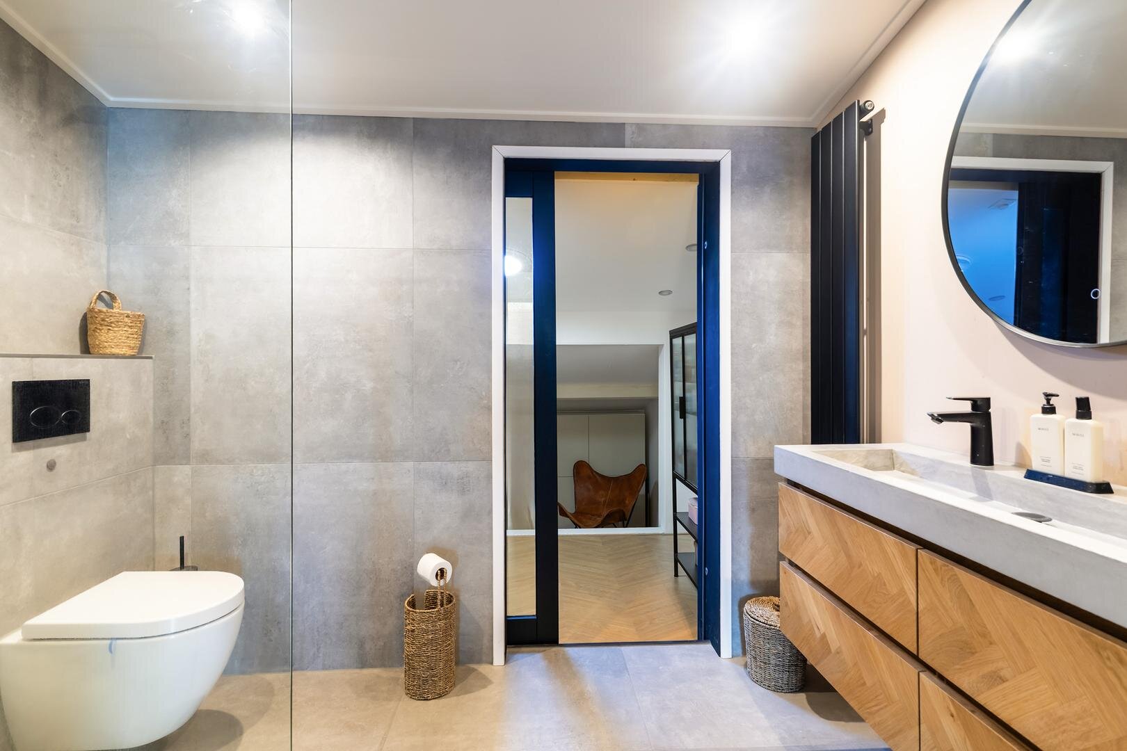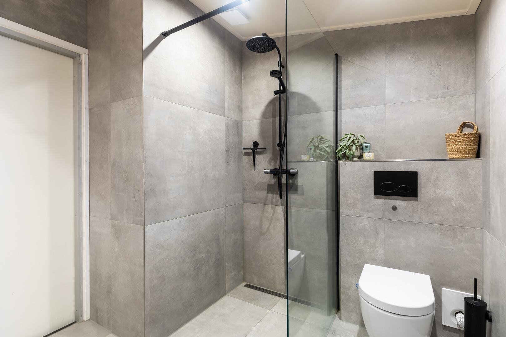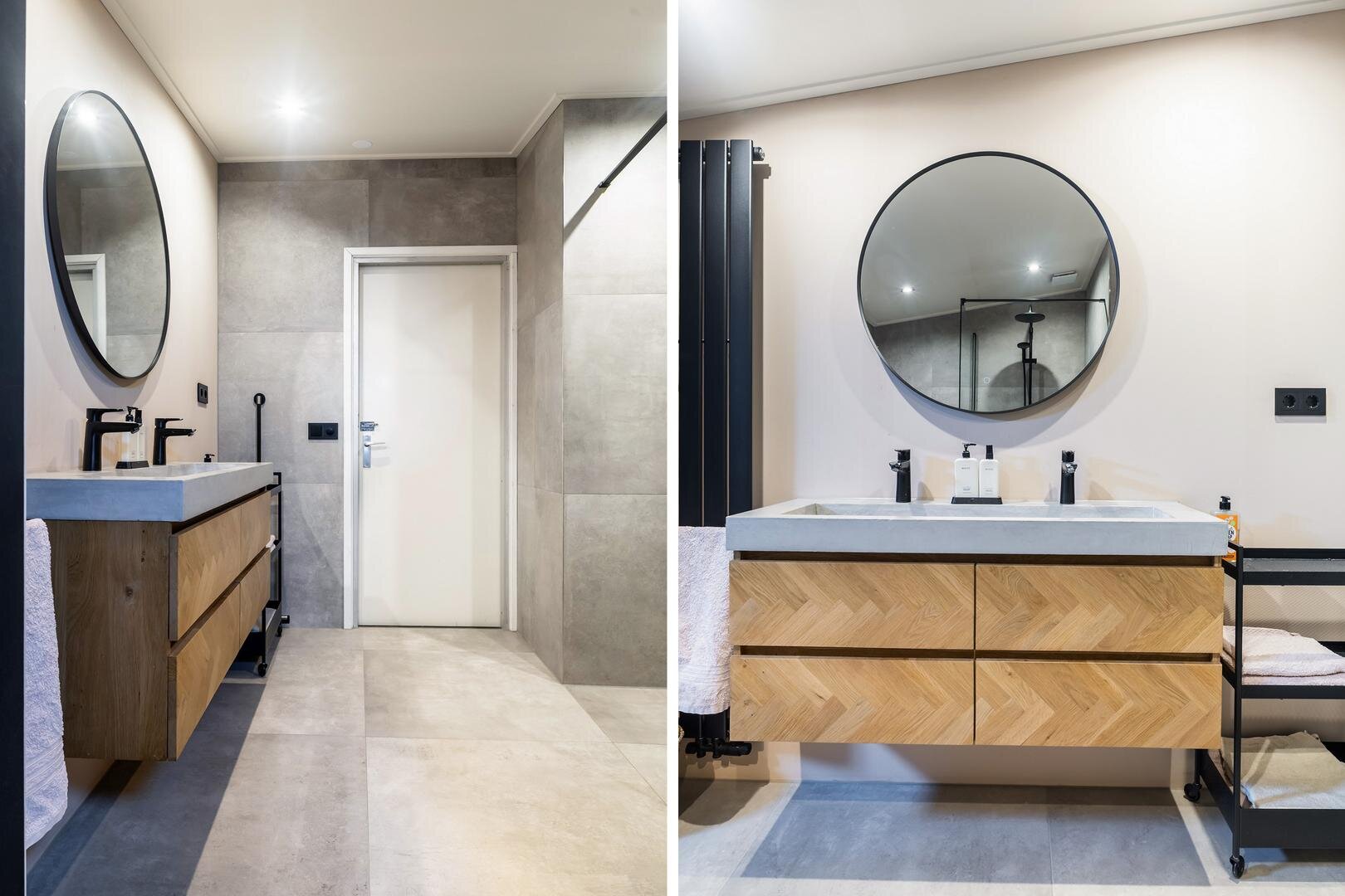 -moderne badkamer (2024) v.v. inloopdouche, vloerverwarming, dubbele wastafel met meubel, tweede toilet en mechanische ventilatie