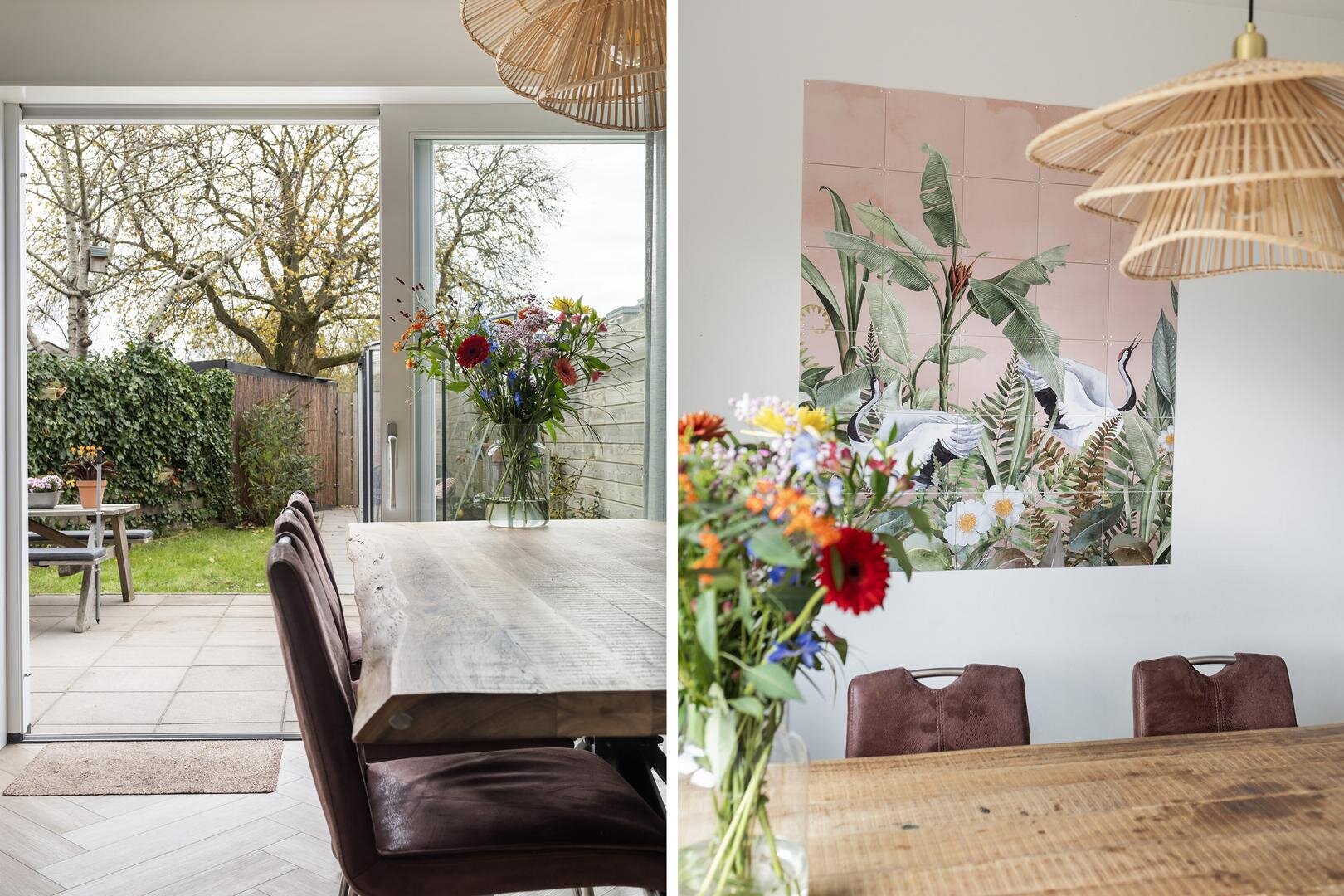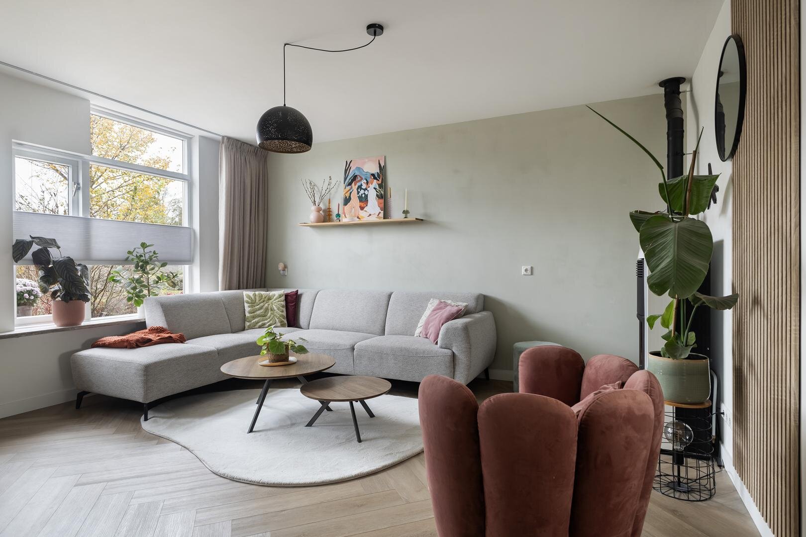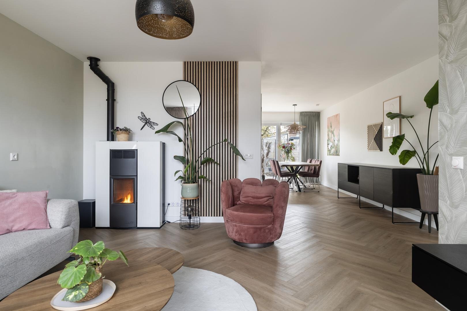 - L-vormige woonkamer (circa 34 m2) v.v. een pellet cv-kachel (Dielle Ostro 20 KW) en fraaie schuifpui naar de achtertuin
