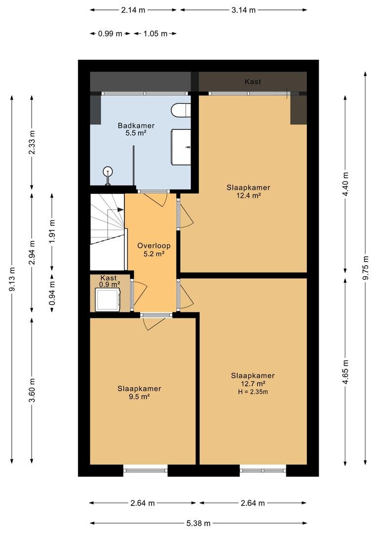 - 2e en 3e slaapkamer aan de voorzijde van de woning (circa 10 en 13 m2)