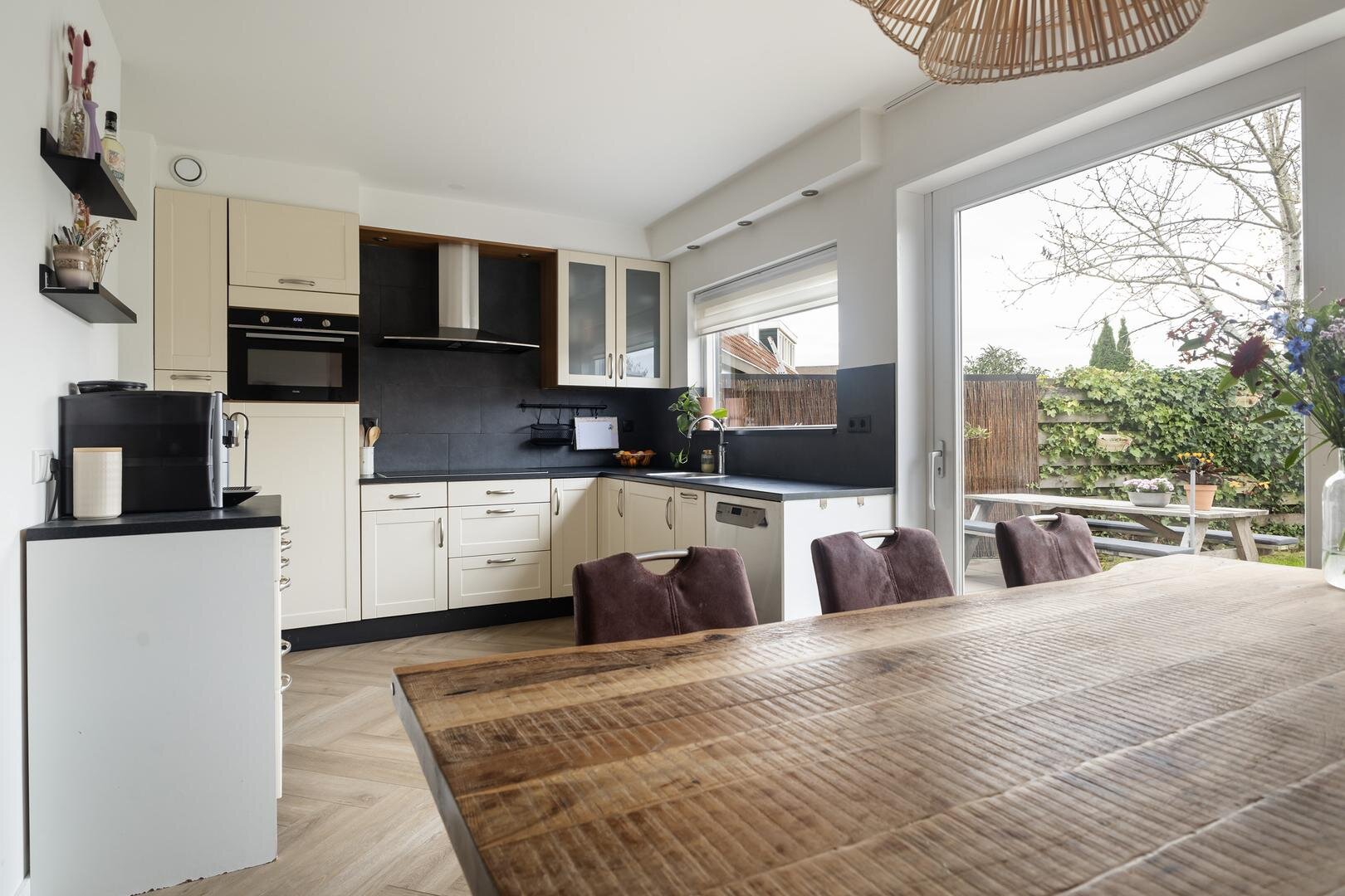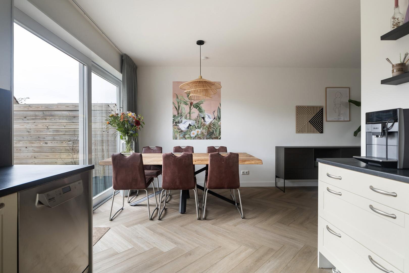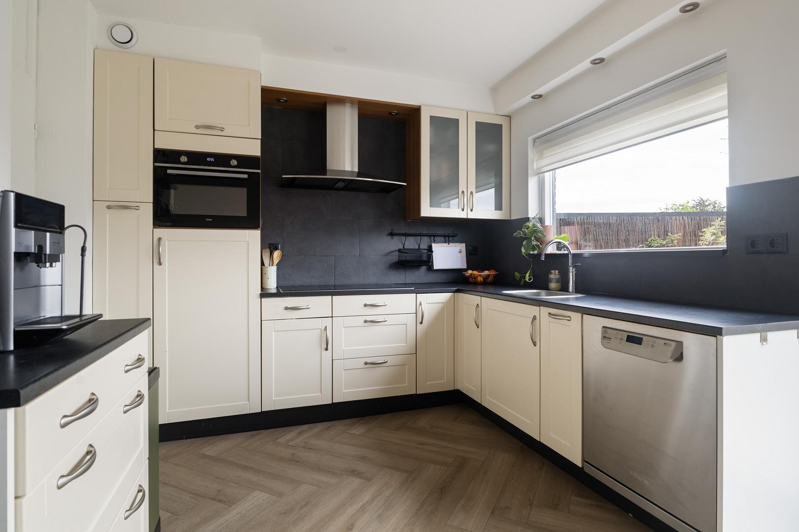 - open keuken met inbouwapparatuur: oven, vaatwasser (Miele), inductiekookplaat, koelkast en afzuigkap.