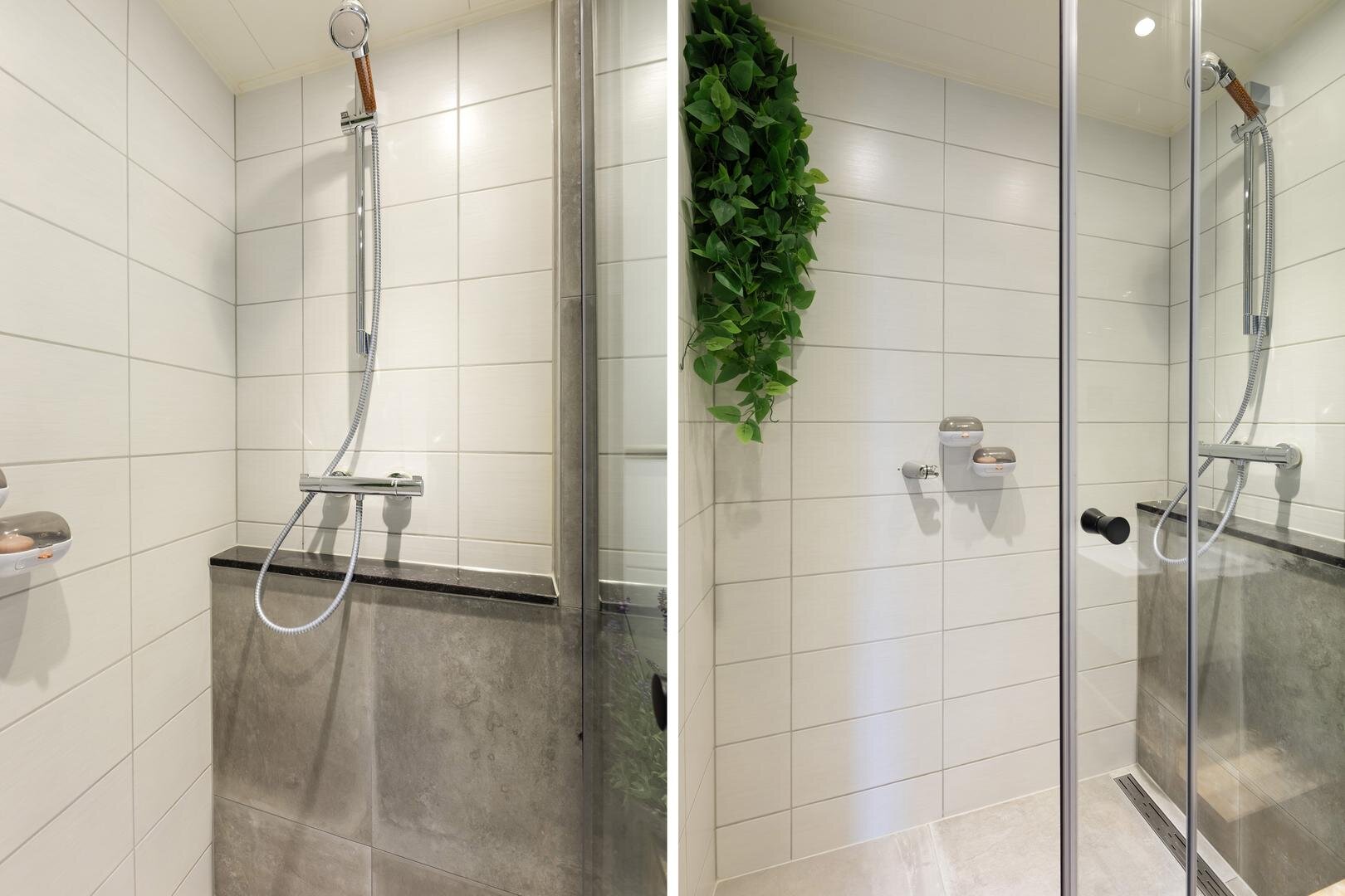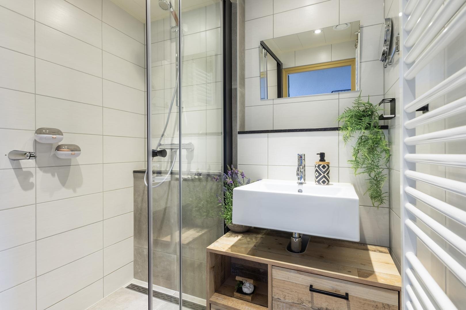 - moderne badkamer v.v. douche, wastafel met meubel en designradiator