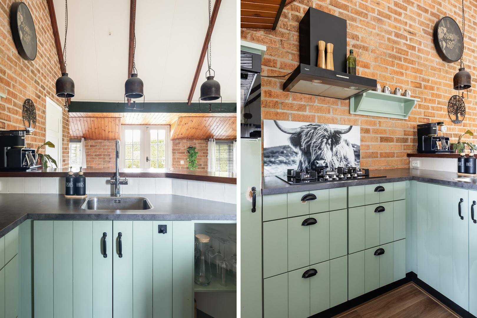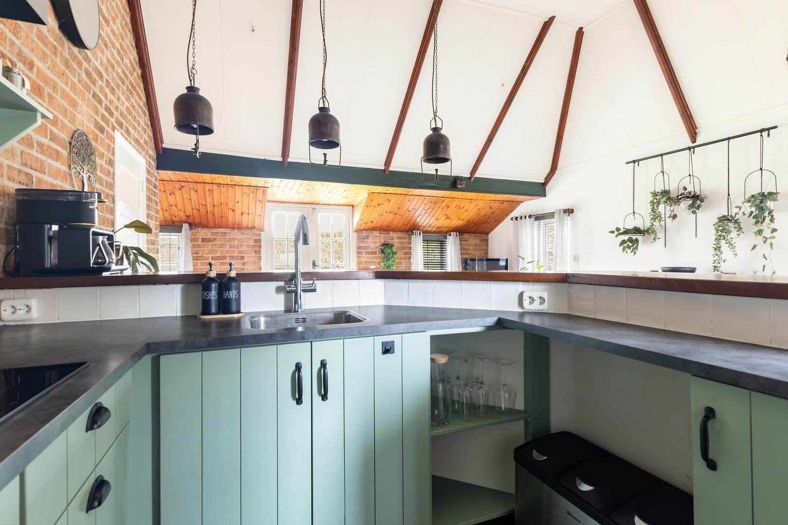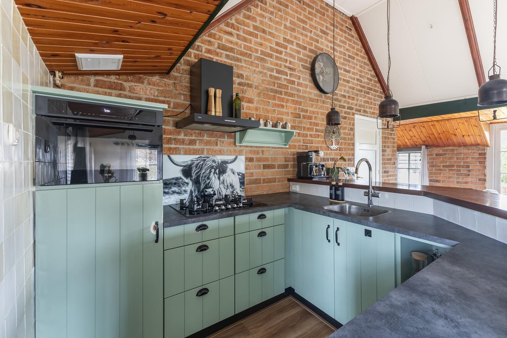 - open keuken v.v. inbouwapparatuur: 5-pits gasfornuis, combi-oven, heetwaterkraan en koelkast