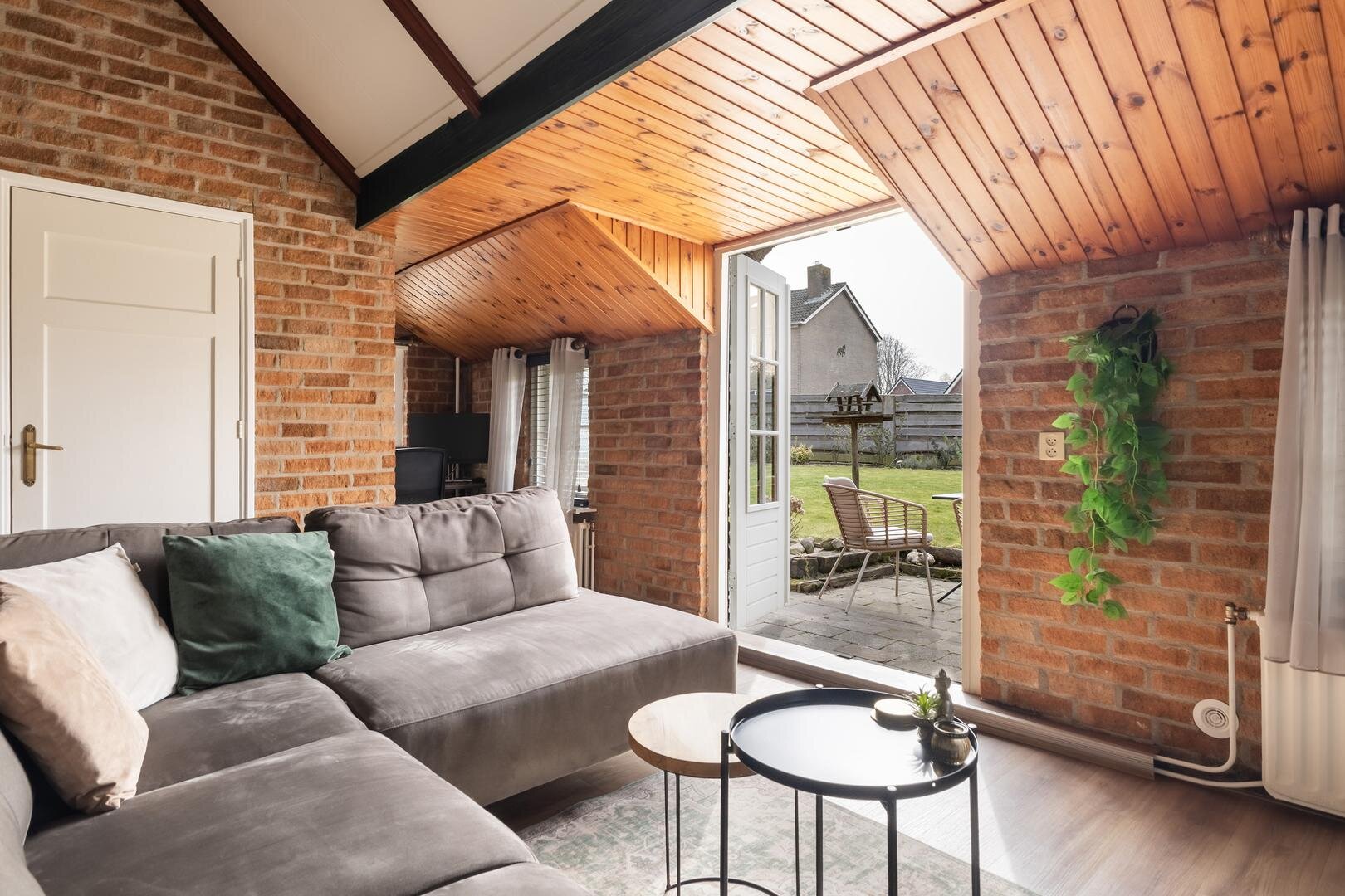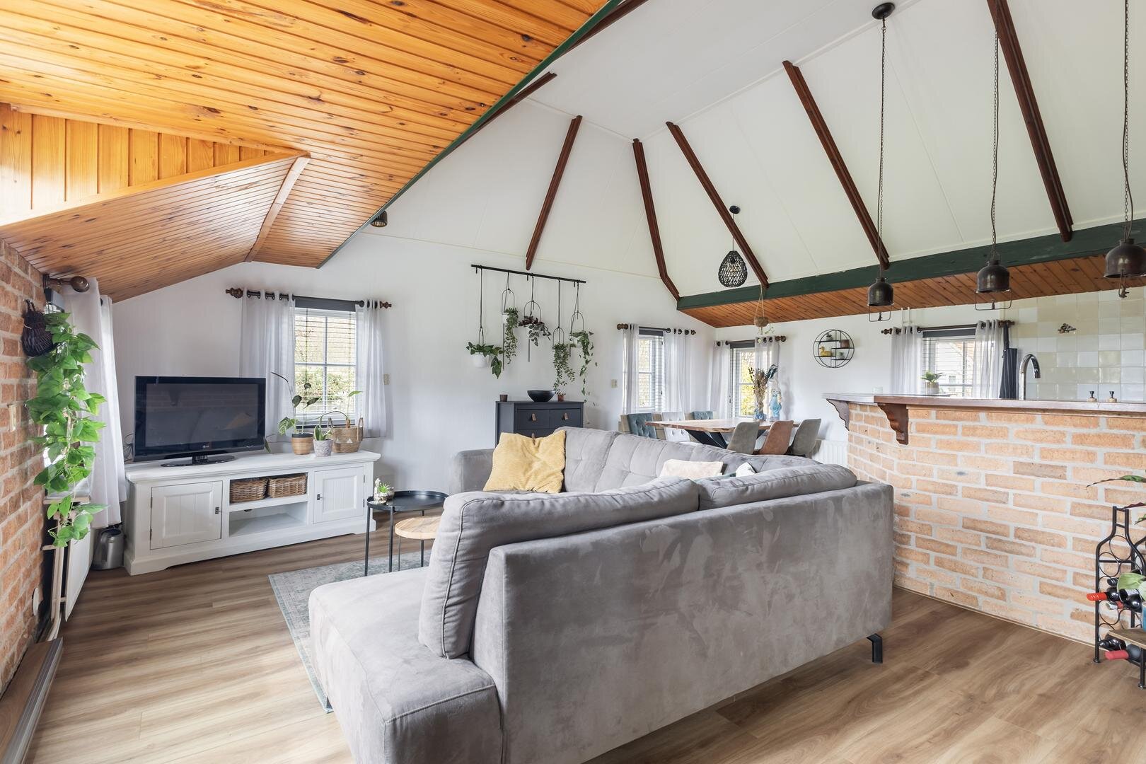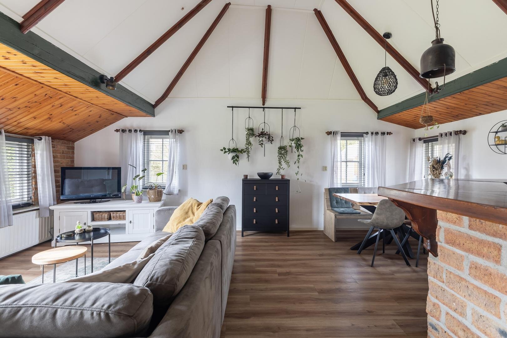 - sfeervolle woonkamer met hoog plafond